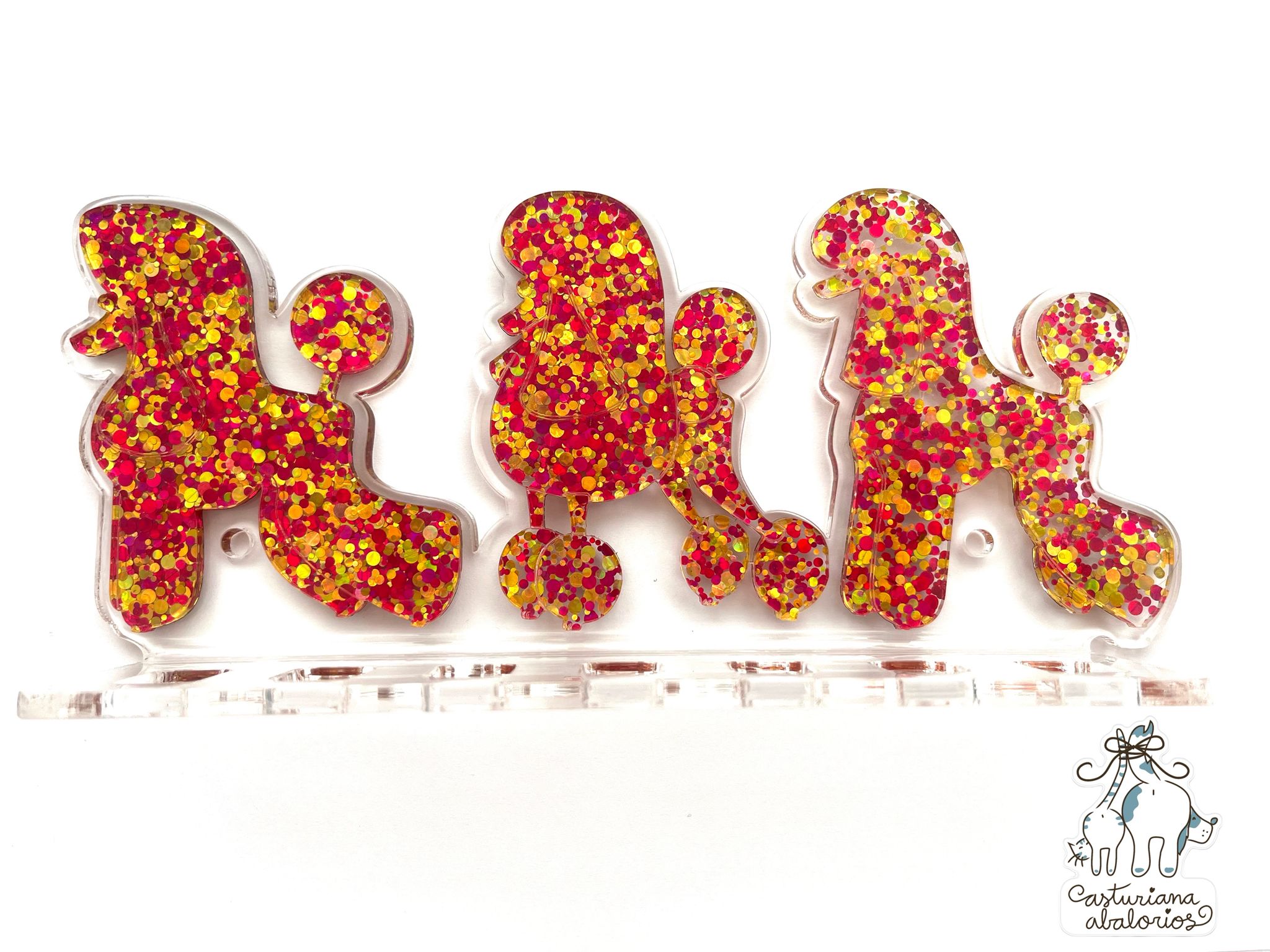 Precioso portatijeras para 7 tijeras con 3 siluetas de caniche en metacrilato de brilli brilli. Es único, elegante y súper original! Lo puedes atornillar a la pared o pegar al azulejo con pegamento tipo patex.