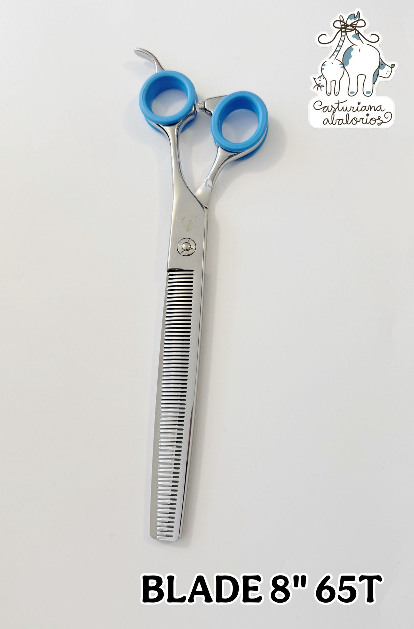 Tijera de esculpir de 8 pulgadas y 65 dientes, offset, ligera y ergonómica. Acero 440C Premium. Apoyadedos fijo y tornillo ajustable mediante llave.