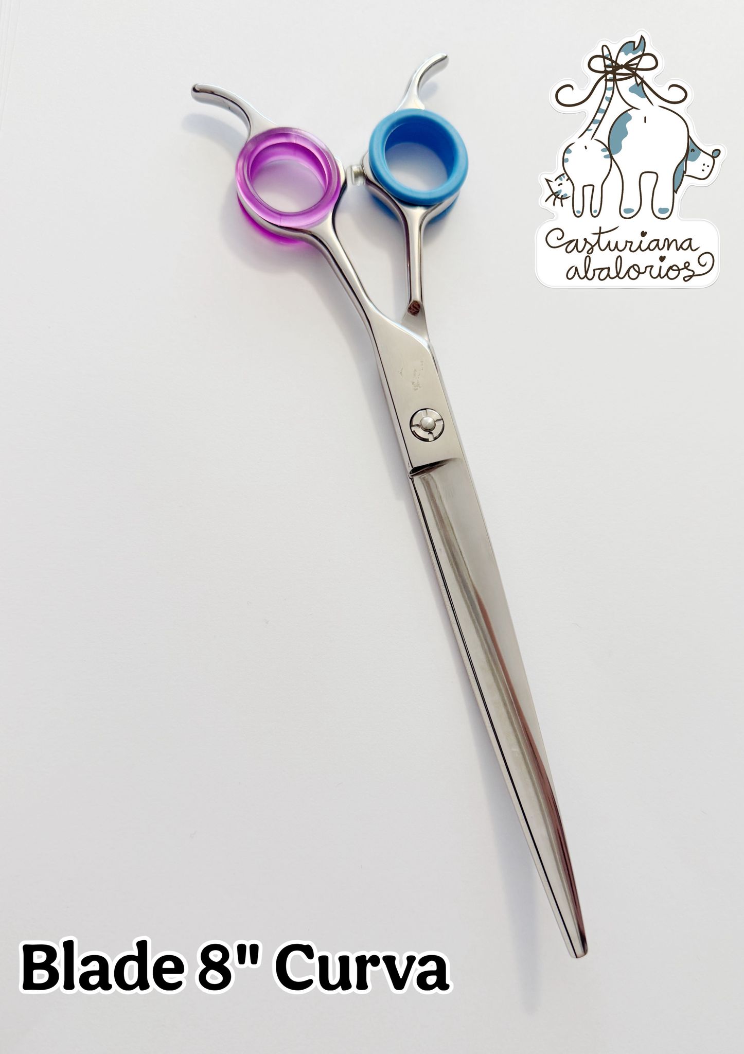 Tijera curva muy ligera, de 8 pulgadas, con mango simétrico y apoyadedos fijo. Acero 440C Premium. Filo de navaja. Muy cómoda, muy manejable, muy versátil.