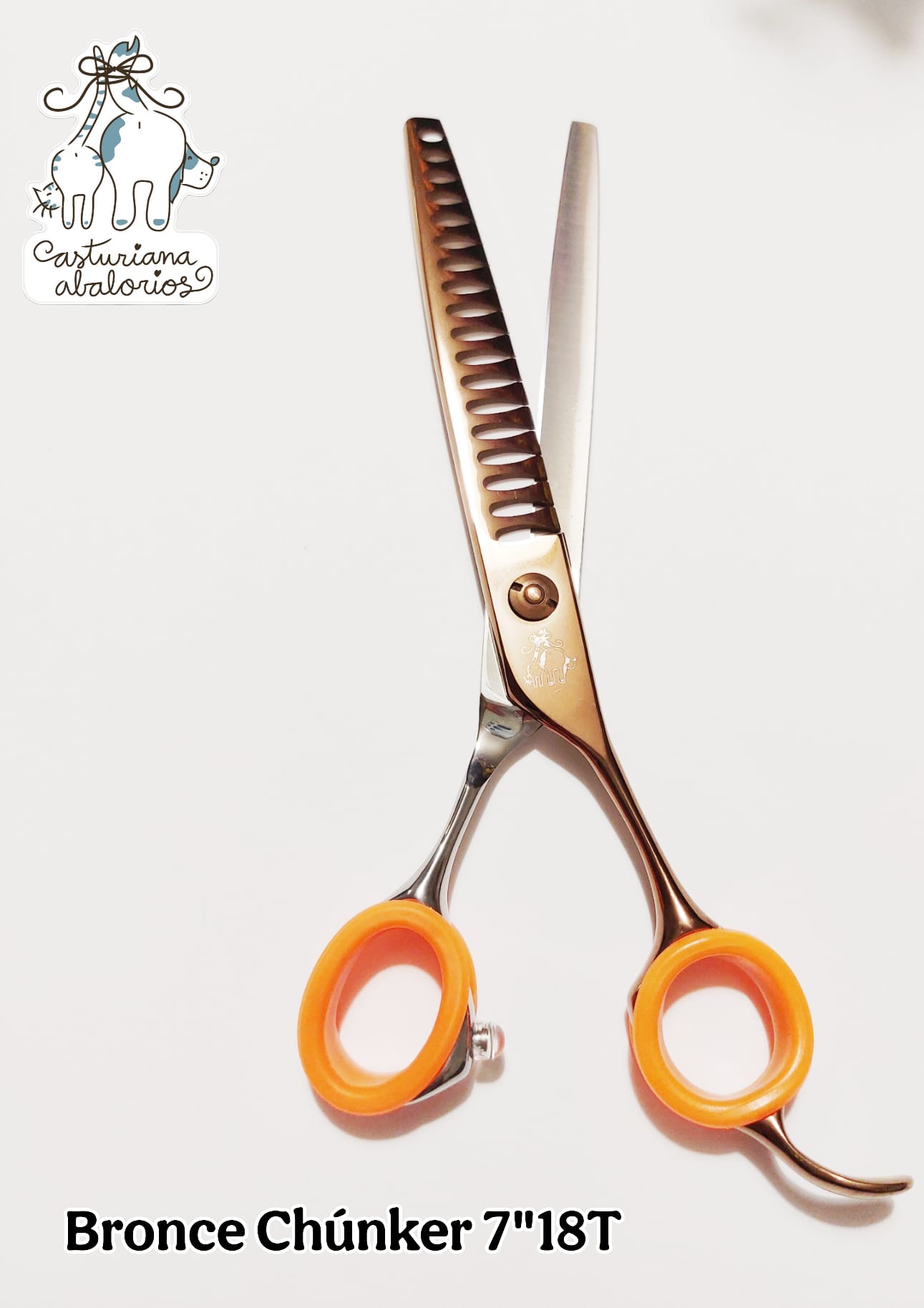 Tijera Chunker de 18 dientes y 7 pulgadas. Acero 440C Premium. Ergonómica y ligera. Tornillo de ajuste manual, mango offset y apoyadedos fijo.
