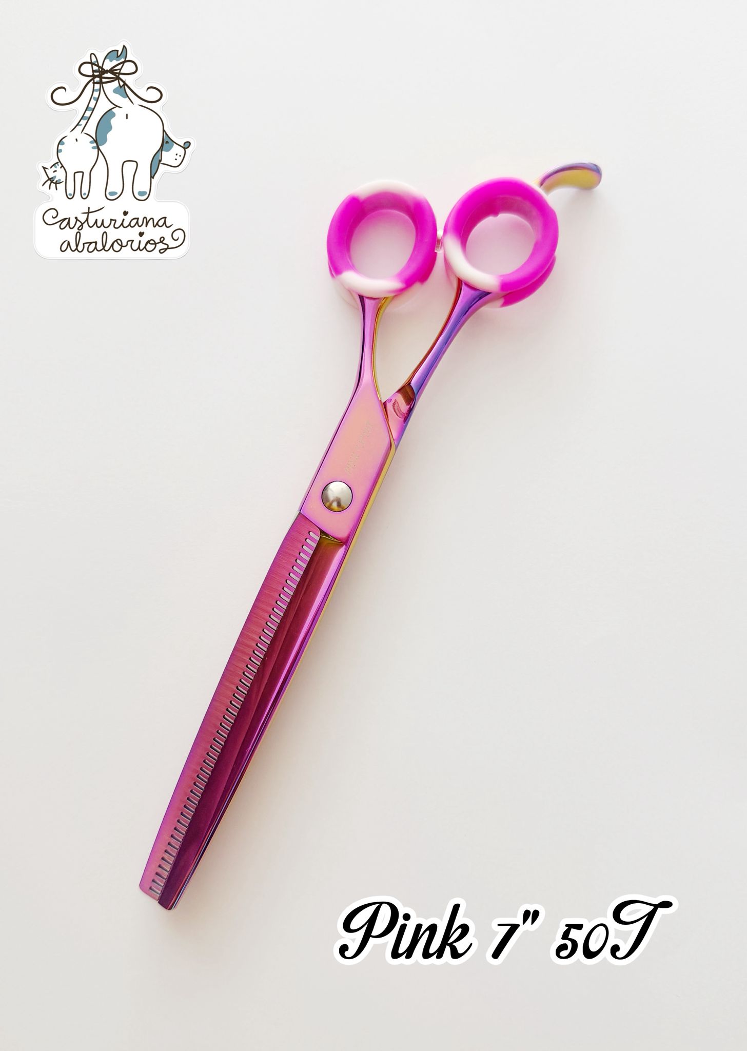 Tijera de esculpir de 7 pulgadas y 50 dientes, offset, ligera y ergonómica. Recubierta en titanio. Acero 440C Premium. Apoyadedos fijo y tornillo ajustable manual. Vaciado aprox 25-30%.