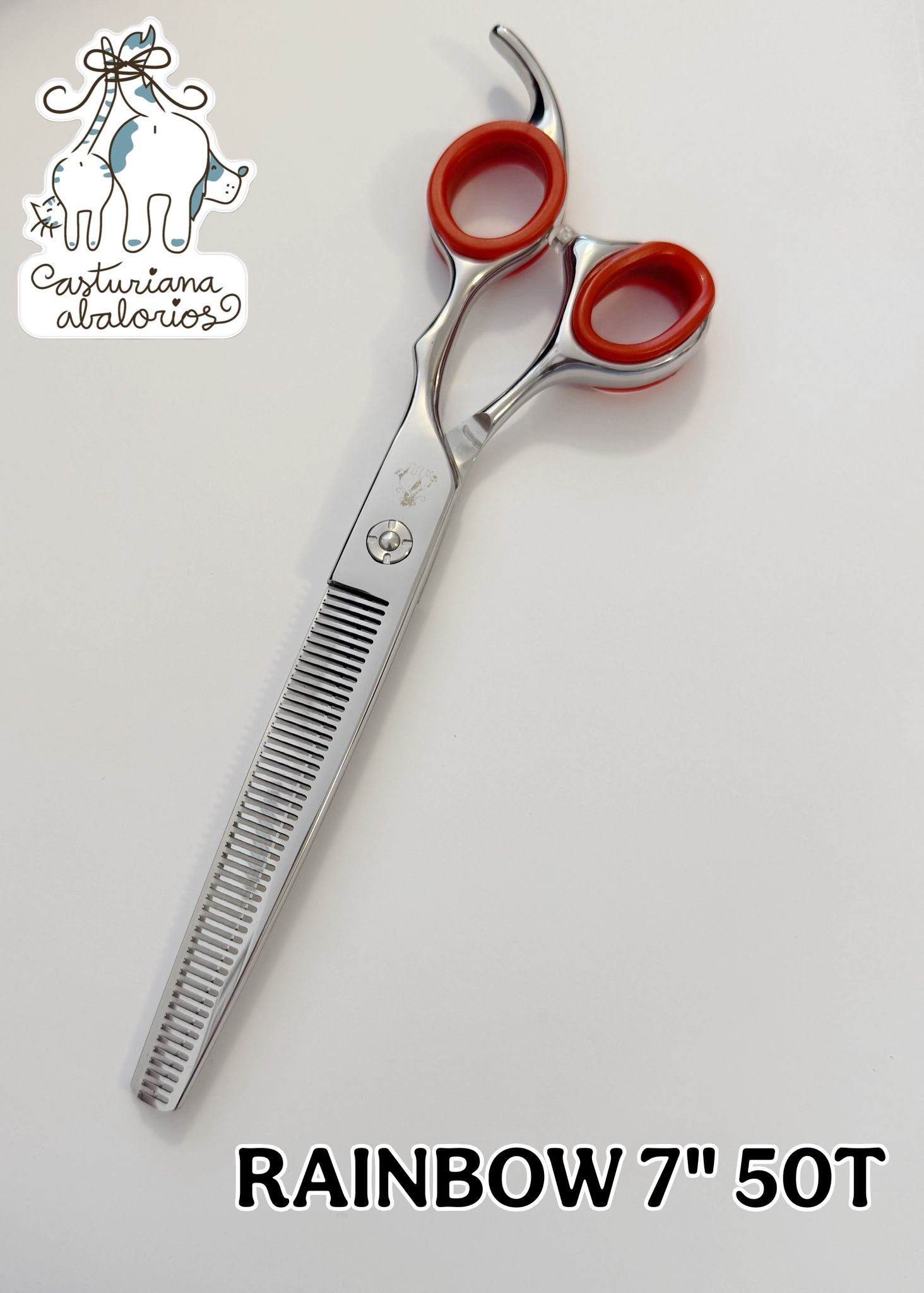 Tijera de esculpir de 7 pulgadas y 50 dientes, offset, ligera y ergonómica. Acero 440C Premium. Apoyadedos fijo y tornillo ajustable mediante llave.